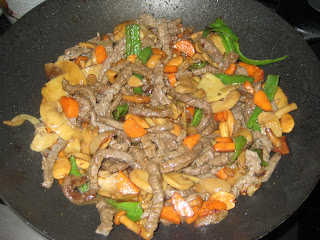 Servir recién hecho, las verduras deben quedar al dente y la carne hecha por fuera pero rosada por dentro, por eso el proceso es rápido pero con el fuego al máximo y sin dejar en ningún momento de remover.