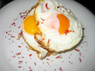 Acomodamos los huevos encima con cuidado de no romper las yemas y espolvoreamos con el polvo de tomate.